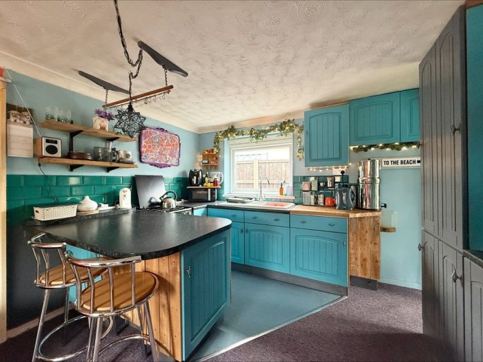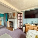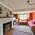 OPEN PLAN KITCHEN / DINING / LIVING SPACE 19' 2" x 11' 5" max (5.84m x 3.48m) kitchen is fitted with a range of wall and base units with worksurfaces over; inset one and a half bowl sink with mixer tap; inset LPG gas cooker and hob; tiled splashbacks; UPVC double glazed windows to both sides; feature fireplace with decorative brick surround, pamment hearth, wooden mantel and inset wood burning stove.