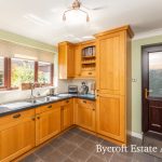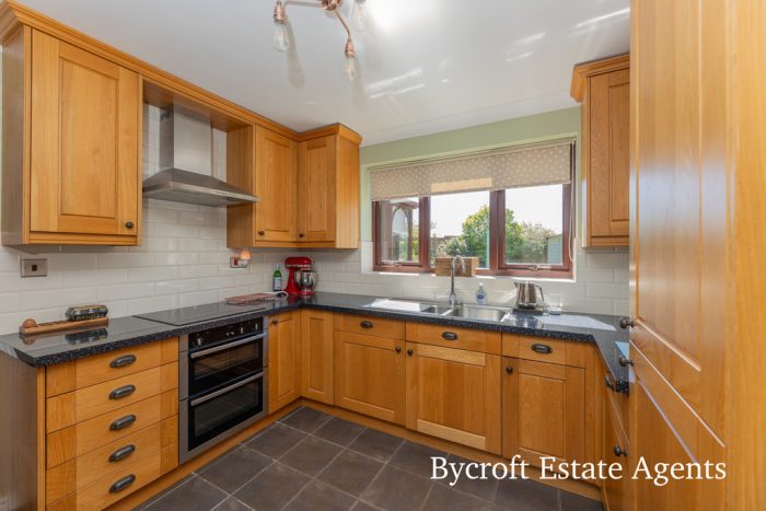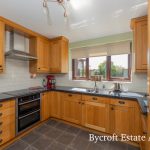 KITCHEN 10' 2" plus recess x 9' 6" (3.12m x 2.90m) fitted with a range of traditionally styled solid wood fronted wall and base units with square edge worksurfaces over; inset stainless steel one and a half bowl sink with mixer tap; built in double electric oven; inset induction hob with cooker hood over; tiled splashbacks; integrated dishwasher and fridge; UPVC double glazed window to rear; UPVC double glazed door to side; tiled flooring.