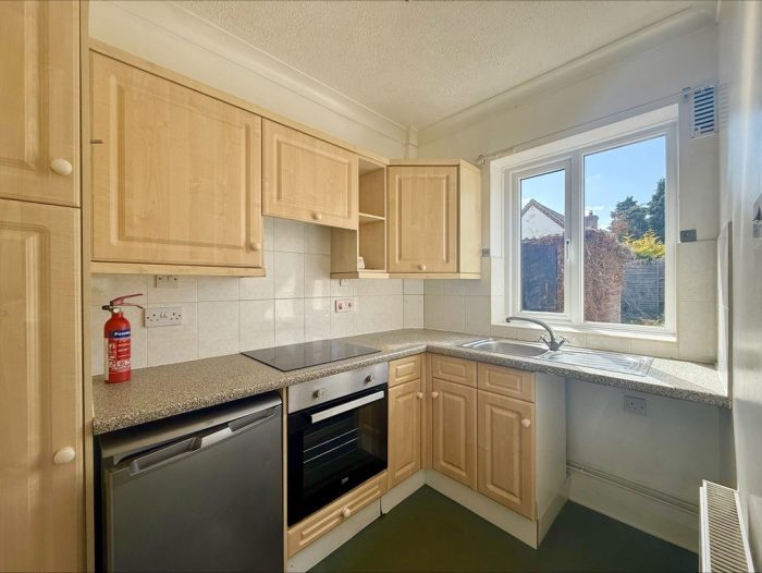 KITCHEN 8' 6" x 5' 11" (2.59m x 1.8m) fitted with a range of wall and base units with roll edge worksurfaces over; inset stainless steel single drainer sink with mixer tap; built in electric oven with four ring electric hob and cooker hood over; space for fridge freezer; tiled splashback; UPVC double glazed window to rear.