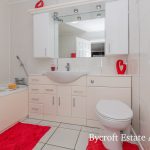 EN SUITE bath with mixer tap and shower attachment; vanity unit comprising wash hand basin with mixer tap, wc with concealed push button cistern and a range of cupboards and drawers with mirror over and two wall cabinets; chrome heated towel rail; frosted window; tiled flooring.