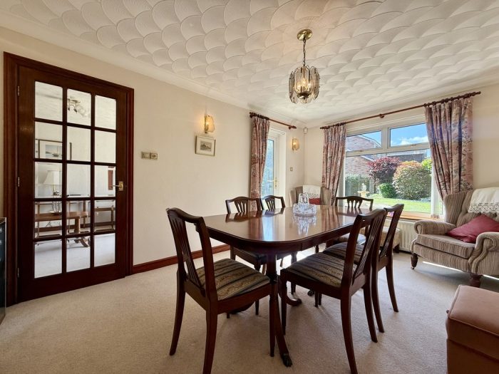 OUTSIDE To the front of the property there is a brickweave double width driveway offering space for two cars, integral single garage with up and over door, light and power, two lantern lights, l-shaped lawn with low dwarf walling and side border with shrubs and plants. Wrought iron gate with paved side pathway round to a beautifully presented and well maintained enclosed rear garden with large paved patio area, raised shaped lawn with borders well stocked with shrubs, plants and trees, feature circular patio and stepping stone pathway to timber shed, outside light, outside tap.