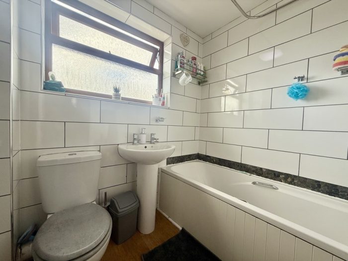 BATHROOM wc; pedestal wash hand basin; bath with mixer tap and shower attachment; frosted window; chrome heated towel rail.
