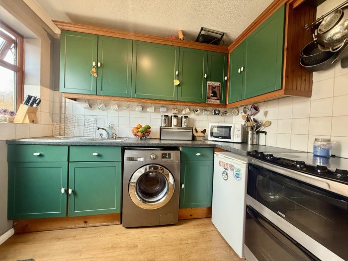KITCHEN 8' 9" x 6' 11" (2.67m x 2.11m) l-shaped worktop with a range of base cupboards and drawers; Zanussi oven; space and plumbing for washing machine; space for fridge; one bowl sink with mixer tap; range of wall units; window and door to rear garden.