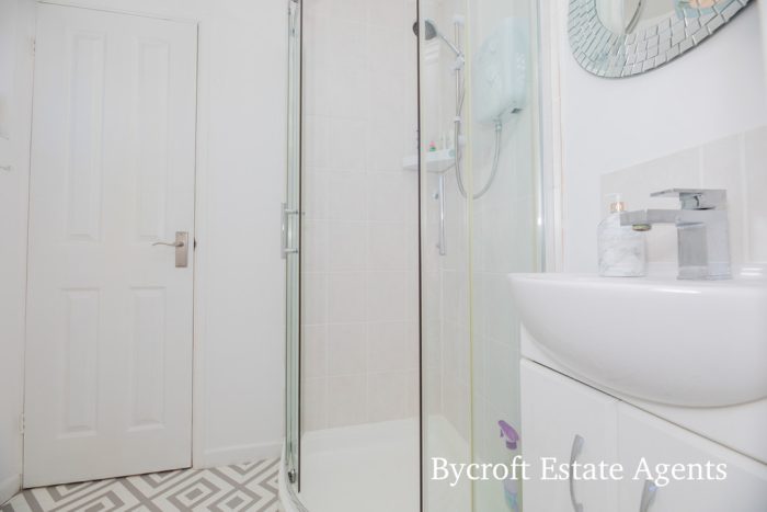 EN SUITE 5' 11" x 4' 7" (1.8m x 1.4m) fitted with a white suite comprising of a low level wc; corner quadrant shower cubicle with sliding door, wall mounted shower unit and tiled wall coverings; vanity wash hand basin with mixer tap, storage cupboards below and tiled splashback; UPVC double glazed window to rear; built in airing cupboard.