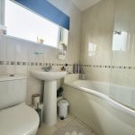 BATHROOM  wc; pedestal wash hand basin; shower bath with curved screen and mains shower fittings; fully tiled walls; frosted window; tiled flooring; chrome heated towel rail.