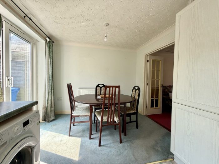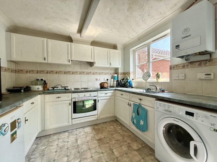 KITCHEN / DINER 14' 8" x 9' 6" (4.47m x 2.9m) u-shaped worktop with a range of base cupboards and drawers; built in oven with four ring hob; stainless steel one bowl sink with mixer tap; space and plumbing for washing machine; space for fridge; range of wall units; rear window; sliding patio doors to rear garden; Vaillant gas boiler; radiator.