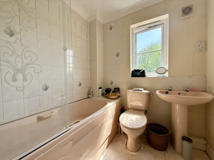 BATHROOM bath; wc; pedestal wash hand basin; frosted window; radiator; shaver point; extractor fan.