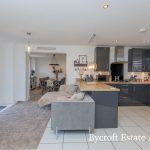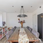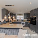 KITCHEN/BREAKFAST ROOM 20' 2" x 15' 3" maximum (6.15m x 4.65m) large worktop/breakfast bar with a range of cupboards and drawers under including integrated dishwasher; washing machine; one and a half bowl sink with mixer tap; four ring gas hob; side larder cupboards with eye level Bosch oven and grill; range of wall units; cupboard housing Valliant gas boiler; Neff light and extractor fan; tiled floor; door to rear garden; radiator; downlights; large opening through to: