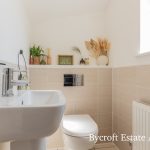 CLOAKROOM pedestal wash basin with mixer tap; wc with concealed push button cistern; frosted double glazed window; radiator; tiled floor.