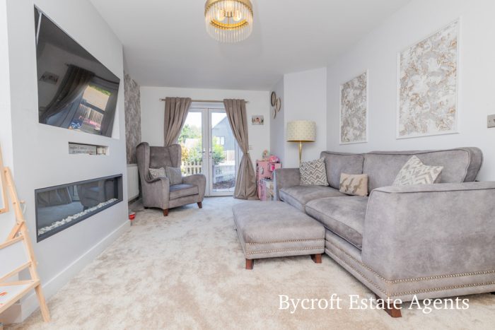 LOUNGE 20' 1" x 10' 10" (6.12m x 3.3m) corner window to front aspect; upvc double glazed French doors to garden; built-in electric fire with media recess; two radiators.