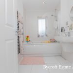 FAMILY BATHROOM bath with mixer tap and shower attachment; wall hung wash basin with mixer tap; wc with concealed bush button cistern; chrome heated towel rail; frosted double glazed window; tiled floor; shaver point.