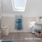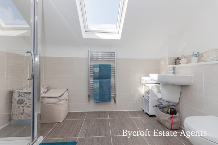 EN SUITE shower cubicle with mains shower fitting; part sloping ceiling with Velux window; wall hung wash basin with mixer tap; wc with concealed push button cistern; downlights; chrome heated towel rail.