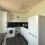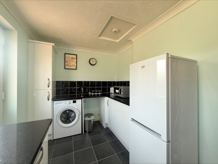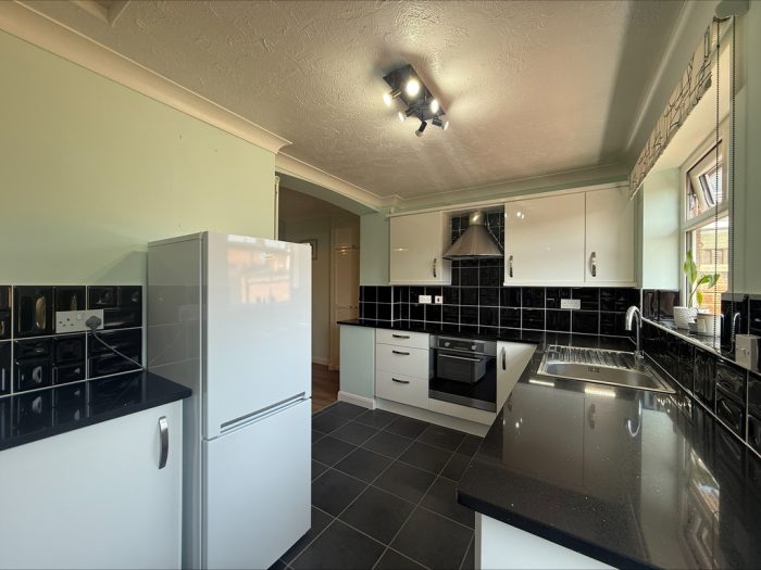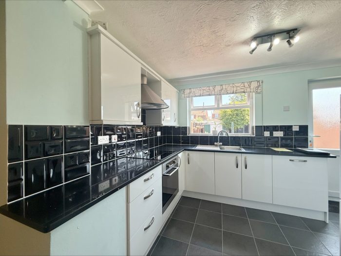 KITCHEN 8' 6" x 14' 3" (2.59m x 4.34m) fitted with a range of wall and base units with quartz worksurfaces over; inset stainless steel sink with mixer tap; integrated electric hob with cooker hood over; built-in electric oven; integrated dishwasher; plumbing for washing machine; space for tumble dryer; space for fridge/freezer; tiled splashbacks; upvc double glazed window to rear; upvc double glazed door to rear and loft access.