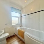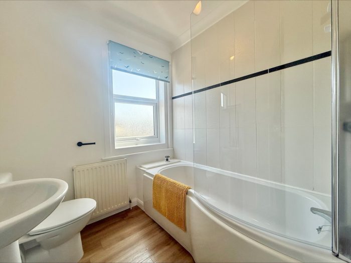 BATHROOM 6' 5" x 6' 5" (1.96m x 1.96m) fitted with a white suite comprising pedestal wash hand basin; low level wc; panelled bath with mixer tap and wall mounted electric shower unit over, shower screen and tiled splashbacks; double glazed window to rear.