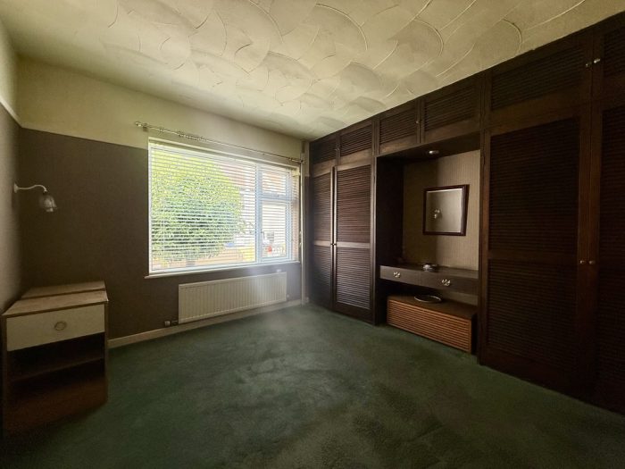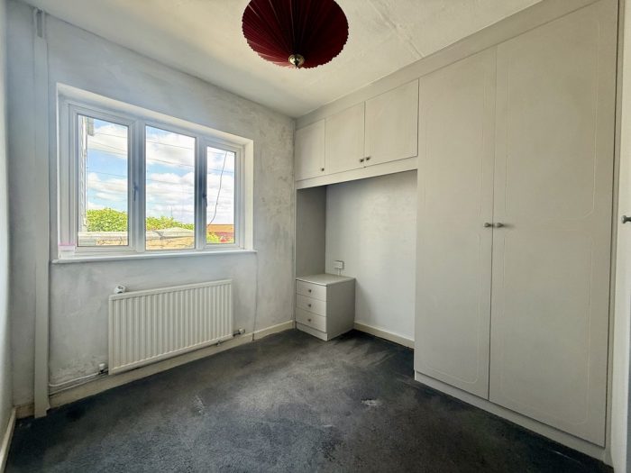 BEDROOM 2 10' 2" x 12' 2" (3.1m x 3.71m) including built-in units comprising triple wardrobe; vanity unit with drawers; single bed recess; bedside unit; high level storage cupboards; side window; radiator. En suite cloakroom with wc; wash hand basin; extractor fan.