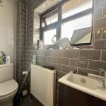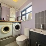 CLOAKROOM / UTILITY wc; vanity wash hand basin with mixer tap and storage cupboard; worktop with space and plumbing for washing machine and tumble dryer; Worcester boiler; tiled flooring; radiator; frosted window.
