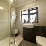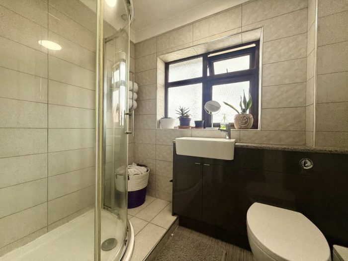 SHOWER ROOM shower cubicle with mains fittings and two showerheads; vanity unit comprising wash hand basin with mixer tap, wc with concealed push button cistern and storage cupboards; chrome heated towel rail; fully tiled walls; frosted window; extractor fan.
