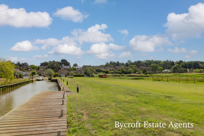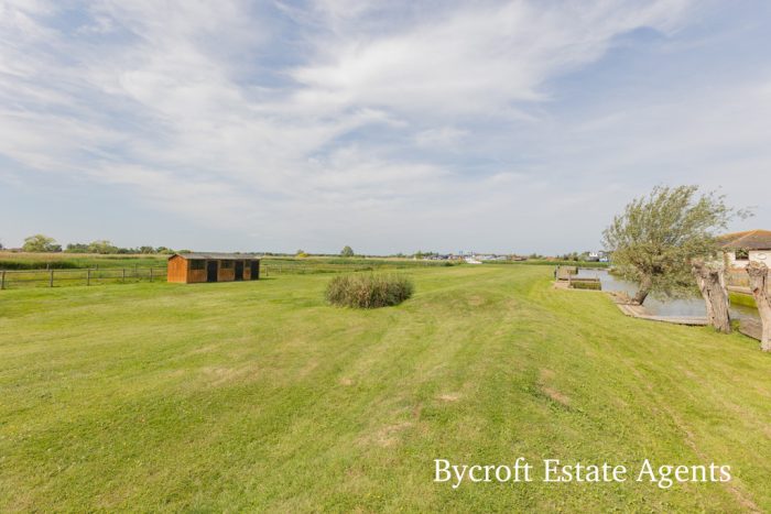 River Frontage of approximately 180ft quay headed mooring for a large boat or several smaller boats or alternatively the mooring could be rented out. Large garage/workshop with electric up and over door, pair of double glazed windows to the rear, and large window to the side, also housing the oil fired boiler, range of base units with worktop over, sink with hot and cold water, wall units, plumbing for washing machine and tumble dryer, space and plumbing for an American style fridge/freezer. The garage could potentially be used as an annexe if required. To the left hand side of the garden there is post and rail fencing. Stabling boxes for two horses and small hay store/tack room with electricity . There is a cut being supplied by the River Waveney with quay heading providing a further 300 ft of mooring with electric supply and bollard lights and a large slipway for launching boats.