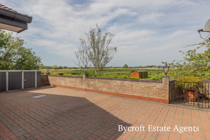 OUTSIDE Herons Acre is approached via a private road serving four properties. To the front of the property there is a large brick weave driveway providing parking for at least eight vehicles with iron gates giving access to the rear of the property garden stables and river frontage. Pathway giving access to the opposite side of the property. Borders to the front of the property which are well stocked and mature trees and shrubs. To the rear are beautiful gardens with elevated patio area enjoying fantastic river views over the River Waveney. Large mature lawned gardens.