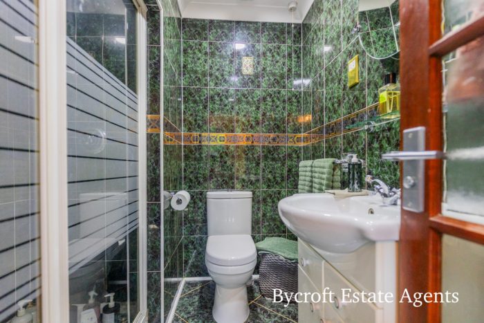 EN SUITE SHOWER ROOM With double width shower; vanity hand wash basin with storage under; tiled walls; radiator; extractor fan.