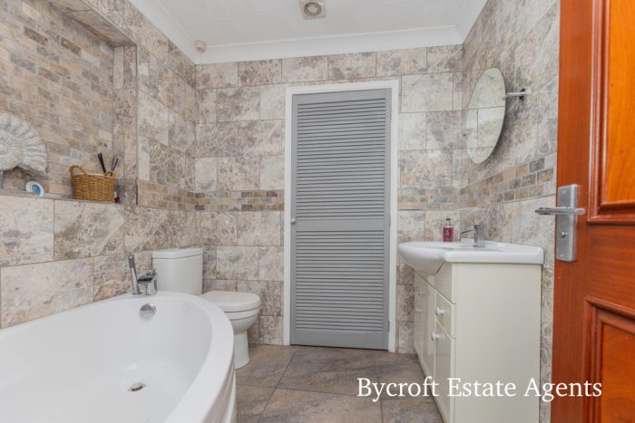 BATHROOM Large corner bath; vanity wash hand basin; wc; tiled floor and walls; radiator; airing cupboard with shelving incorporating large solar hot water cylinder.
