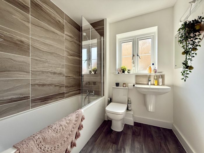 BATHROOM bath with mixer tap, shower attachment and screen; wc; wall hung wash hand basin with mixer tap; frosted window; chrome heated towel rail.