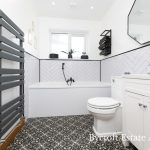 FAMILY BATHROOM with bath; matt black mixer tap with shower attachment; vanity unit comprising WC; concealed push button system, black matt hand basin; mixer tap; storage cupboard under; white double glazed window; heated towel rail; downlights; extractor fan.