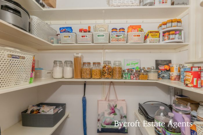 KITCHEN 14' 11" x 9' 5" (4.55m x 2.87m) fitted with a range of wall and base units with roll edge worksurfaces over; inset four ring gas hob with cooker hood over; built in electric oven; space for American style fridge freezer; inset one and a half bowl stainless steel single drainer sink with mixer tap; tiled splashbacks; UPVC double glazed window to side; built in pantry cupboard with tiled cold shelf.