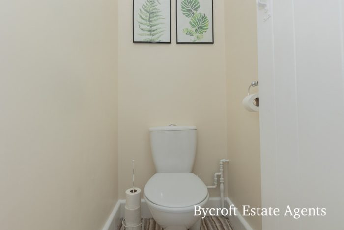 CLOAKROOM 4' 9" x 2' 11" (1.45m x 0.89m) low level wc; UPVC double glazed door to side.