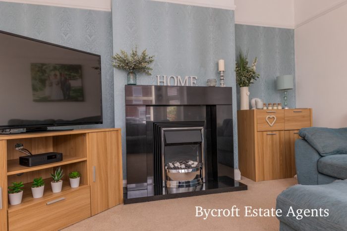 SITTING ROOM 16' 8" max into bay x 12' 7" max (5.08m x 3.84m) UPVC double glazed bay window to front; picture rail; feature fireplace with inset electric fire and decorative surround.