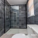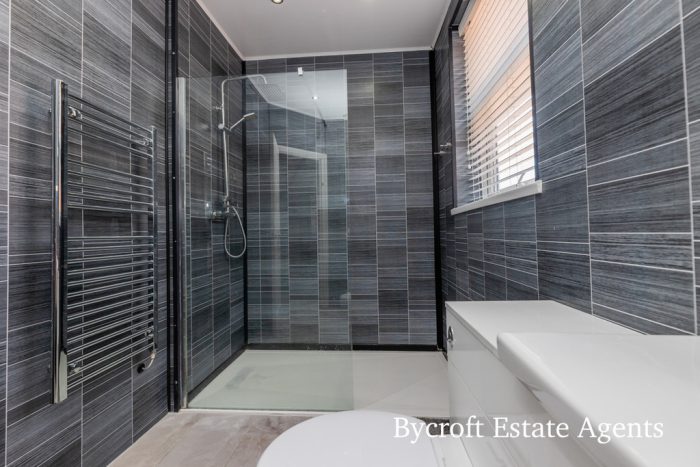 SHOWER ROOM 10' 7" max x 5' 8" max (3.23m x 1.73m) fitted with a white suite comprising of a vanity wash hand basin with mixer tap and storage cupboard; low level wc; walk in shower cubicle with screen and wall mounted shower unit with hand and soaker attachments; heated towel rail radiator; modern vertical style radiator; fully tiled walls; wall mounted cabinet; extractor fan; UPVC double glazed window to side.