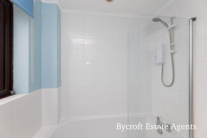 BATHROOM 6' 9" x 5' 11" (2.06m x 1.8m) fitted with a white suite comprising pedestal wash basin; low level WC; shower bath with mixer tap, shower screen and wall mounted electric shower unit over; tiled splash back; extractor fan; shaver point; UPVC double glazed window to side.