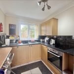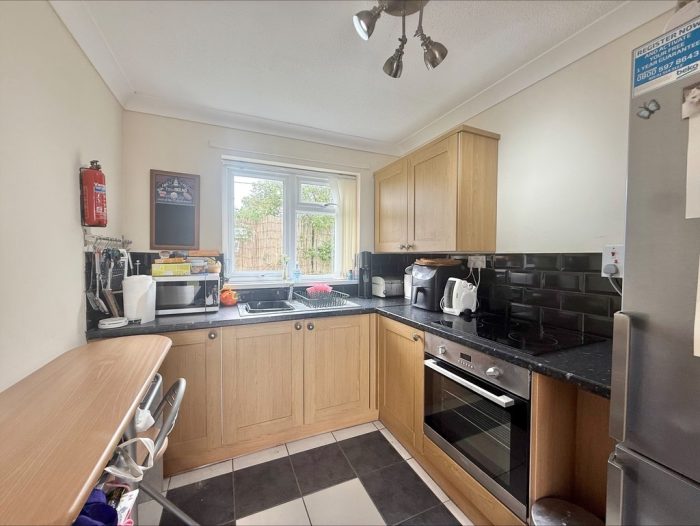 KITCHEN 8' 7" x 7' 5" (2.62m x 2.26m) fitted with a range of wall and base units with roll edge worksurface over; inset stainless steel sink with drainer with mixer tap over; inset electric hob; built-in electric oven; space for fridge/freezer; tiled splashbacks; upvc double glazed window to rear.