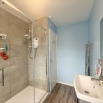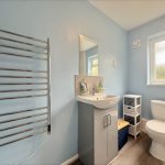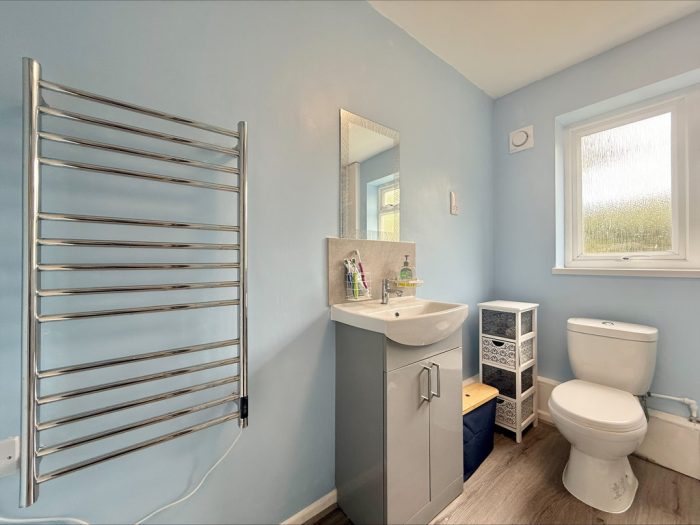 SHOWER ROOM 6' 3" x 8' 8" (1.91m x 2.64m) fitted with a white suite comprising vanity wash hand basin with mixer tap over and storage cupboard below; low level wc; walk-in shower cubicle with sliding shower screen door and wall mounted electric shower unit; tiled splashbacks; upvc double glazed window to rear; extractor fan; shaver point; heated towel rail radiator.
