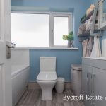 BATHROOM bath with mixer tap and mains shower fittings with 2 shower heads and shower screen; WC with concealed push button cistern; vanity with wash basin with mixer taps and storage cupboard under; chrome heated towel rail; bay window; down lights.