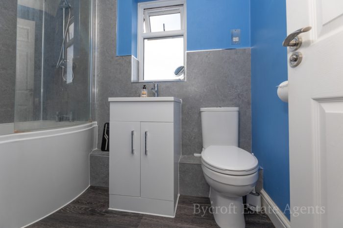 BATHROOM bath with mixer tap, curtain shower screen and mains shower fittings with two shower heads; vanity unit comprising wash basin, mixer taps and storage cupboard under; WC with push button cistern; frosted window; chrome heated towel rail; extractor fan.