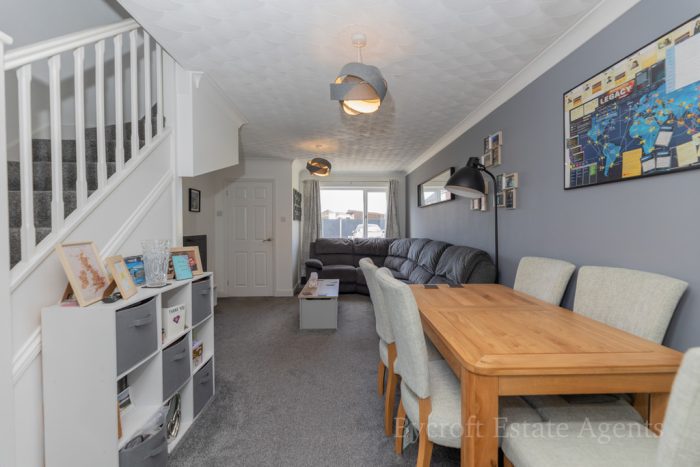A modern 2 bedroom end of terrace house situated in this quiet cul-de-sac location in the popular village of Bradwell close to shops, amenities and schools for all ages. The accommodation comprises entrance hall, lounge/dining room, kitchen/breakfast room, landing, 2 double bedrooms, recently installed bathroom; driveway parking to the front, enclosed rear garden, gas central heating and double glazed windows.