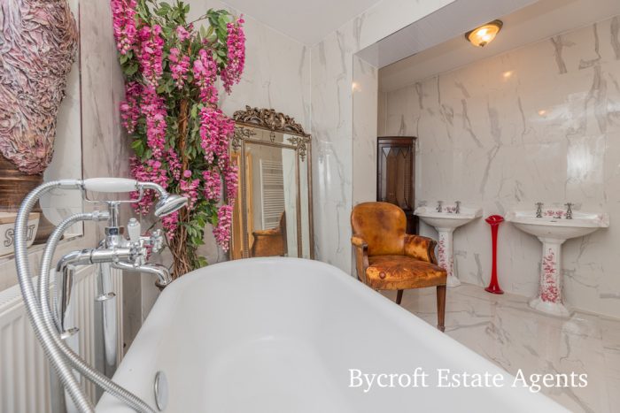 EN SUITE free standing bath with mixer tap and shower attachment; wc with Victorian high level cistern; matching Victorian twin pedestal hand wash basins; tiled walls and floor; 2 heated towel rails; radiator; rear window.