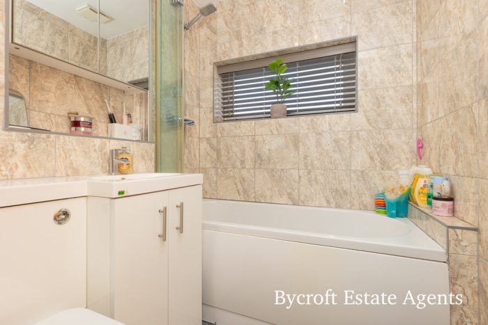 BATHROOM 5' 9" x 5' 6" maximum (1.75m x 1.68m) upvc double glazed window to front; tiled walls; fitted with a white suite comprising of a vanity wash hand basin with mixer tap and storage cupboard below; low level wc; panelled bath with mixer tap with bi-folding shower screen and wall mounted shower unit over; heated towel rail/radiator.
