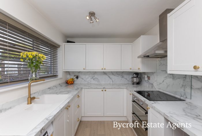 KITCHEN 15' 4" x 7' 6" (4.67m x 2.29m) fitted with a range of wall and base units with square edge worksurfaces over; inset one and a half bowl single drainer sink with mixer tap over; plumbing for washing machine; built-in double electric oven; inset electric hob with cooker hood over; upvc double glazed window to front; space for fridge/freezer; wall mounted gas fired central heating boiler; double glazed composite door to front.