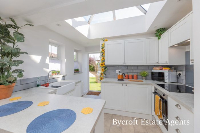KITCHEN/DINER 19' 7" max x 12' 00" max (5.97m x 3.66m) floors to first floor landing; fitted with a range of wall and base units with square edge work surfaces over; inset Belfast style sink with mixer tap over; built in electric oven, inset electric hob with cooker hood over, tiled splash backs; breakfast bar; roof lantern window; UPVC double glazed windows to side and UPVC double glazed door to rear.