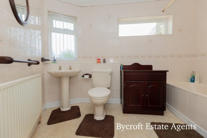 BATHROOM 10' 4" max x 6' 3" max (3.15m x 1.91m) fitted with suite comprising of low level wc; pedestal hand basin and power bath with wall mounted shower unit over; fully tiled walls; extractor fan and 2 UPVC double glazed windows to side.