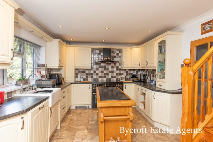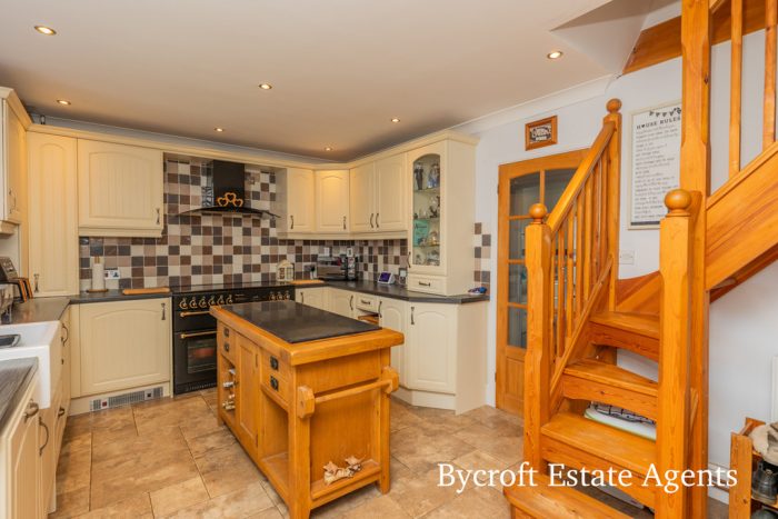 KITCHEN /DINER 29' 2" x 11' (8.89m x 3.35m) fitted with U-shaped worktop; good range of base, cupboards and drawers under, including integrated dishwasher; Range Master oven; ceramic Butler sink with mixer tap; range of wall units, including glass display unit; drawer under; light and extractor; corner cupboard housing the gas boiler; down lights; stairs to Attic Room; 3 frosted side windows; further rear window; 2 radiators; tiled floor; opening to Utility Room.