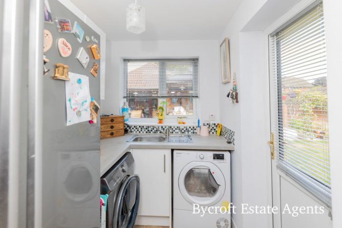 UTILITY ROOM 7' 9" x 5' 7" (2.36m x 1.7m) L-shaped worktop with base cupboard; space and plumbing for washing machine and tumble dryer and American style fridge freezer; stainless steel 1 bowl sink with mixer tap; double wall unit; UPVC side door; rear window; tiled floor.