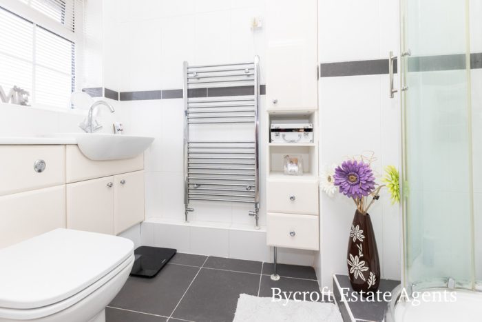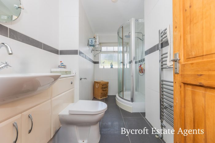 EN SUITE comprising vanity unit with WC, concealed push button cistern; wash hand basin, mixer tap; storage cupboards; shower cubicle with mains fittings; chrome heated towel rail; fully tiled walls and floor; frosted double glazed window; extractor fan.