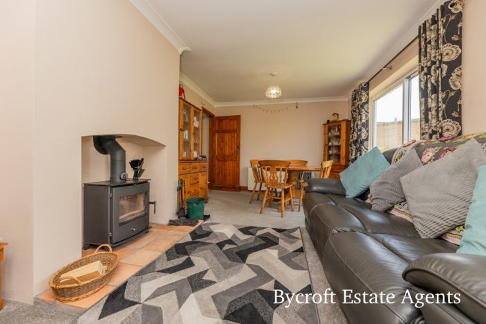 SITTING ROOM 19' 11" x 10' 11" max (6.07m x 3.33m) UPVC double glazed window to rear; UPVC double glazed sliding patio door to rear; fireplace with inset multi fuel burning stove with pamment tiles hearth.