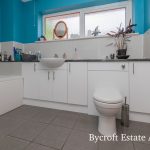 BATHROOM 9' 6" x 6' 7" (2.9m x 2.01m) fitted with a white suite comprising low level wc; vanity hand wash basin with mixer tap over and storage cupboards below; P-shaped panel bath with mixer tap, shower screen and wall mounted electric shower unit over; aqua board splash backs; UPVC double glazed window to side.