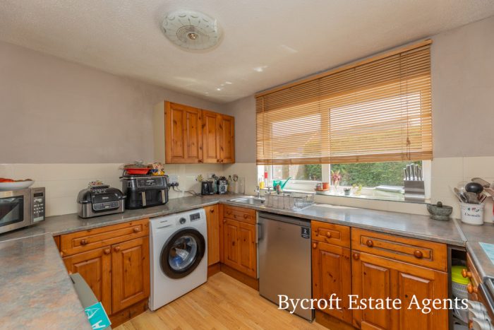KITCHEN 10' 7" x 8' 8" (3.23m x 2.64m) fitted with range of wall and base units with roll edge work surfaces over; inset stainless steel sink with drainer sink; space for fridge freezer; plumbing for washing machine; electric cooker; space for electric oven; UPVC double glazed window to front.