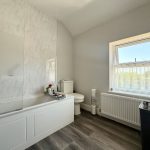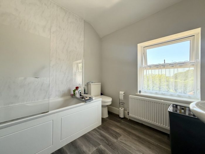 BATHROOM bath with screen and mains shower fittings; wc; pedestal wash hand basin; rear window; radiator; extractor fan.