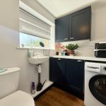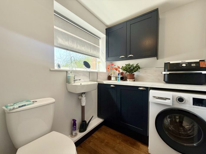 UTILITY / CLOAKROOM 6' 9" x 5' 3" (2.06m x 1.6m) worktop with base unit; double wall unit; space and plumbing for washing machine; frosted window; wc; wash hand basin with mixer tap; radiator; extractor fan.